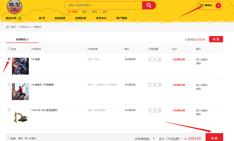 第三步,点击上方购物车,选择商品结算。